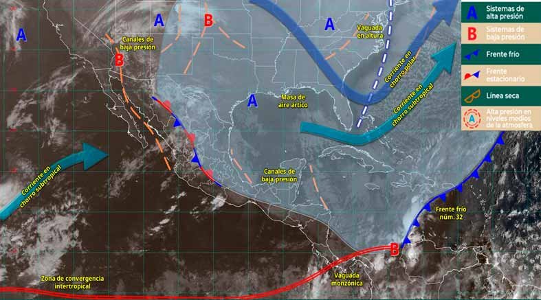 Finalmente, el ingreso de humedad del océano Pacífico ocasionará lluvias y chubascos con posibles descargas eléctricas en estados del occidente, centro y sur del territorio nacional.