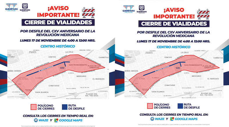 Con motivo del CXV Aniversario de la Revolución Mexicana, este lunes 17 de noviembre se realizarán cierres viales en el Centro Histórico de Querétaro, en el polígono comprendido entre Av. 5 de Febrero, Av. Constituyentes, Av. Ejercito Republicano y Reforma-José María Arteaga.