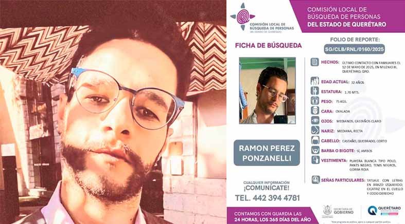 De acuerdo con los reportes, Ramón Pérez Ponzanelli se encuentra desaparecido desde el pasado 12 de mayo 2025, cuando fue visto por última vez en Milenio III, en el estado Querétaro.