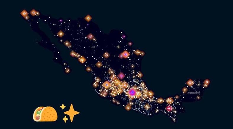 “Los puestos de tacos registrados en México forman este bello universo”, destaca el geógrafo Baruch Sanginés en su Twitter, al lado de un mapa del país donde se iluminan los puntos en los que hay taquerías. Él lo llama “Universo del Taco” o “Taco Universe”.